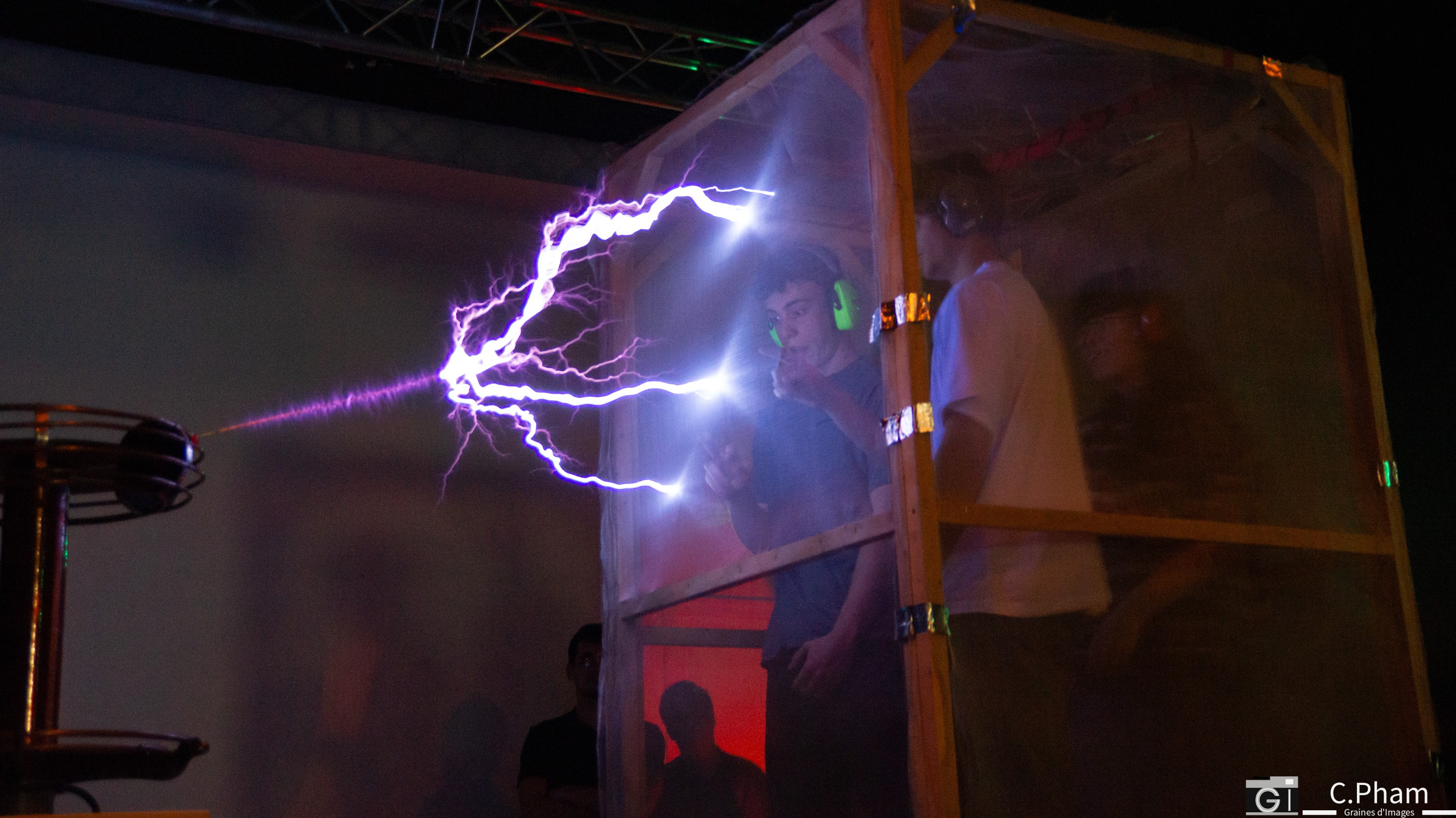 Le pôle électrotechnique conçoit, entre autres, des bobines Tesla et développe des projets avec de l'électricité à haute puissance.
